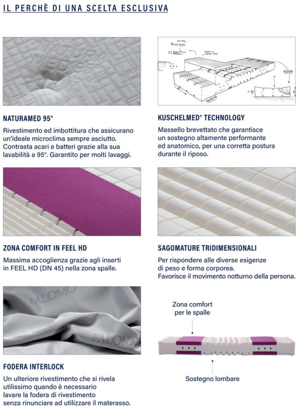 Il materasso Falomo Kuschelmed De Luxe soddisfa tutti gli standard imposti dalle direttive europee e risulta efficace nel prevenire ed alleviare problemi posturali e patologie da decubito. Dal design ergonomico, confortevole, grazie alle sagomature tridimensionali è ideale per chi soffre di lombalgia perchè assicura una maggiore distensione della colonna vertebrale. La portanza progressiva e la ripartizione omogenea della pressione nelle zone critiche del corpo consentono una corretta postura nella fase del sonno. Le zone di contatto risultano più omogenee, rispettando così il maggior carico di spalle, bacino e tallone. I particolari tagli del massello e le superfici in rilievo consentono una notevole flessibilità, che favorisce naturalmente la curva delle spalle e del bacino. I materassi con brevetto Kuschelmed® conferiscono un sostegno lombare ottimale, adattandosi alle diverse esigenze di peso e forma corporea: il particolare taglio del massello è stato infatti studiato con l’avvallo dell’Istituto di Ergonomia di Monaco di Baviera. Per prevenire i problemi posturali e patologie da decubito, la protezione più importante è il movimento; questo è favorito anche durante il sonno dalla particolare sagomatura del materasso. Il materasso Falomo Kuschelmed de Luxe è composto da massello sagomato in SOIA BIO (DN60) ed inserti in FEEL HD (DN45), che accompagnano perfettamente la spalla senza comprimere quando posizionati sul fianco. Sono inoltre disponibili 3 tipi di rivestimenti a scelta tra: FODERA NATURAMED 95° ( Antibatterica, Anti-Acaro con imbottiture ipoallergeniche, lavabile a 95°C ), FODERA BIELASTIC MED 95° ( Anti-Acaro con imbottiture ipoallergeniche, lavabile a 95°C ) e FODERA DUO CLIMA ( Fresca e traspirante, lavabile fino a 60°C ). Vieni a provare il Materasso Falomo Kuschelmed® de Luxe presso il nostro punto vendita il Sanodormire di Lecco.