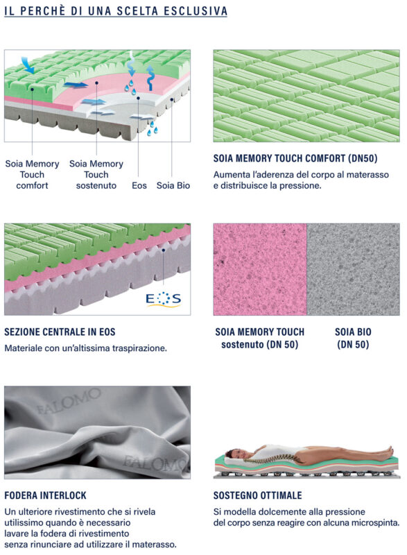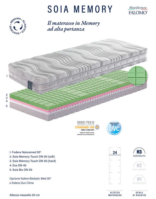 Il materasso Falomo Soia Memory presenta una superficie in Soia Memory Touch (DN 50) che cede dolcemente alla pressione del corpo senza reagire con alcuna contro-spinta, modellandosi perfettamente al profilo del dormiente. La superficie è conformata antidecubito ed è collocata su di un secondo strato in Soia Memory Touch (DN 50) più rigido, ideale per un sostegno ottimale senza compressioni della colonna vertebrale e degli arti. La sezione centrale in EOS (DN 40) è composta da un materiale ad altissima traspirabilità che dona una sorta di ammortizzazione. Il massello in Soia Memory Touch (DN 50) aumenta l’aderenza del materasso e distribuisce uniformemente la pressione che si genera, per effetto del calore corporeo; proprio per questo, nelle zone di maggior calore, il materasso risulta più morbido ed accogliente. La prima sezione di superficie in Soia memory Touch, riduce al minimo i punti di pressione favorendo così la circolazione sanguigna. Il materasso Soia memory è praticamente una perfetta combinazione di accoglimento e sostegno al tempo stesso per tutte le parti del corpo. Vi sono inoltre 3 differenti soluzioni di rivestimento disponibili per questo materasso, ciascuna diversa dalle altre per caratteristiche di lavaggio e composizione: fodera Naturamed 95° ( lavabile fino a 95° ), fodera Bielastic Med 95° ( lavabile fino a 95° ) e Duo Clima ( lavabile fino a 60° ). Vieni a provare il materasso Falomo Soia Memory presso il nostro punto vendita il Sanodormire di Lecco.