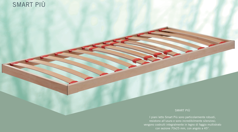La rete con doga larga Smart+ è particolarmente robusta, resiste all’usura ed è incredibilmente silenziosa. Caratteristica principale della rete è la sua particolare rigidità, che la rende piuttosto adatta a materassi a molle insacchettate indipendenti o materassi con molleggio tradizionale ma comunque compatibile con prodotti in Aquatech, lattice, Memory Fresh Blue, Memory, Soia Bio. Smart+ è costruita integralmente in legno di faggio multistrato con sezione 70×25 mm, con angolo a 45° ed angolare in gomma predisposto per l’eventuale aggiunta di piedini. Le doghe sono realizzate in faggio evaporato e montate a livello con il telaio della rete. Le doghe della zona lombo–sacrale sono doppie e dotate di regolatori di rigidità che ne consentono la personalizzazione con il semplice scorrimento verso l’esterno. Vieni a provare la rete con doga larga Smart+ presso il nostro punto vendita il Sanodormire a Lecco.